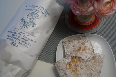Além das flores, um pacote de Clarinhas de Fão, do outro lado do rio. Há muitas casas a fazê-las, e a reclamá-las como sendo as originais, mas estas são as nossas preferidas.