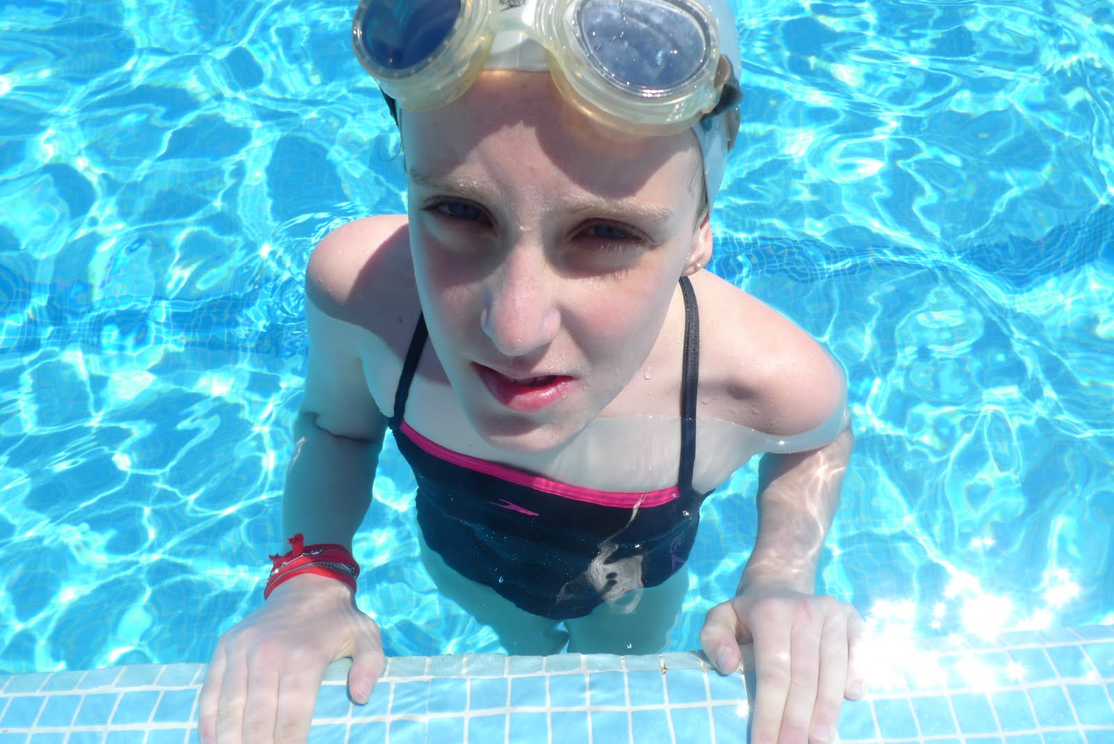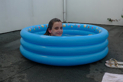 Hoje quis estrear a piscina que recebeu de brinde numa loja, à falta de uma piscina grande, como aquela onde, na semana passada, participou nas competições, ou a das férias de verão do ano passado, esta serviu muito bem. Gosta tanto de água, que diz que não sabe onde gosta mais de estar se na água se em terra. Eu acrescento, de preferência com a cabeça no ar...