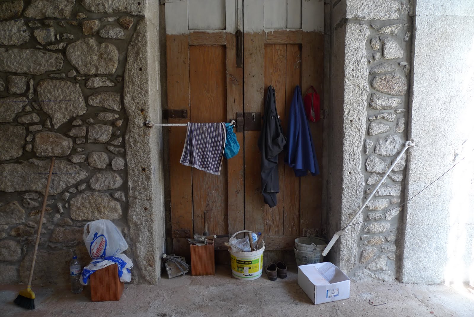 As obras começaram, a primeira coisa em que reparei, foi nos pregos, na porta que vamos recuperar, a servirem de cabide. Aproveitamos para fazer uma visita aos vizinhos de quintal, a horta bem tratada revela alguns segredos... As videiras, depois de podadas, são atadas com todo o cuidado que a tarefa exige, com pequenos raminhos de vime, as chilas crescem, penduradas na ramada, pelo meio da uvas Americanas, as pêras e a outra fruta caem ao chão antes de amadurecer, por causa do bicho que as consome. Mais uma vez viemos com os braços cheios, um molho de espinafres, pêras, maçãs, tomates, pimentos...