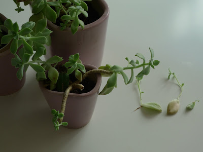 Gosto muito desta planta é uma Graptopetalum, gosto não só por ser bonita e dar uma flor branca muito delicada, parecida com uma estrela, mas pela capacidade que demonstra em se fazer renascer e multiplicar. E faz isso com uma naturalidade incrível, sem auxílio de nada nem ninguém. Numa situação adversa, quando tudo parece perdido, recupera e começa a ganhar nova vida, uma nova planta. Não passa de uma planta, das muitas que tenho cá em casa, mas para mim é também uma lição. Também é importante ouvirmos as plantas.