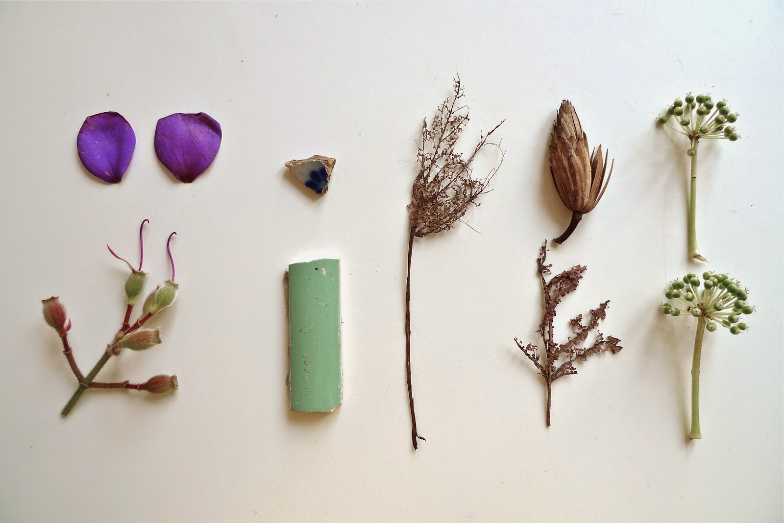 Dessas viagens curtas acontece trazer para casa coisas inesperadas com que me deparo pelo caminho. Dum encontro marcado no centro da cidade para entregar uma encomenda em mão, trago mais uma colecção, um conjunto de pequenas coisas. Do jardim, as folhas apanhadas do chão, duma berma uma flor roxa da qual só se salvaram as pétalas e umas quantas flores mais resistentes, já perto de casa bocados de azulejos partidos. Na minha rua descubro um estendal e no estendal descubro a mesma paleta de cores do que trago guardado nos bolsos e tudo isto acontece assim, sem grandes explicações, mas ganha um sentido especial e deixa-me a pensar qual é que será.