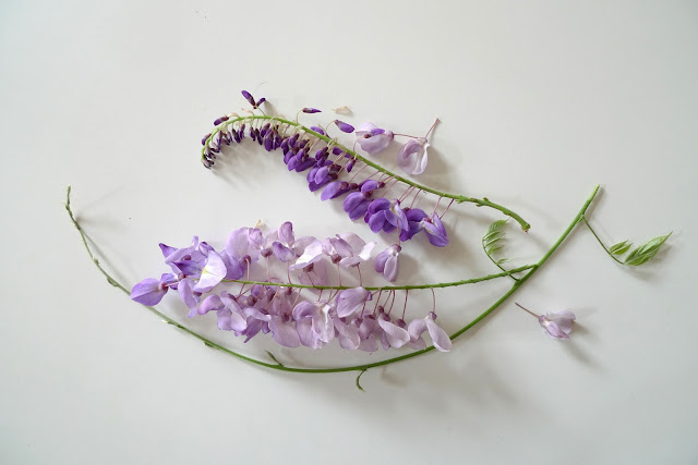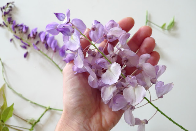 A semana passada colhi uns ramos da Glicínia que corre o muro do vizinho. Com a chuva que entretanto caiu, caíram também as flores, despiram-se os cachos lilases e esta semana toda a trepadeira é apenas uma mancha verde.